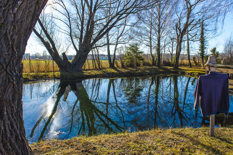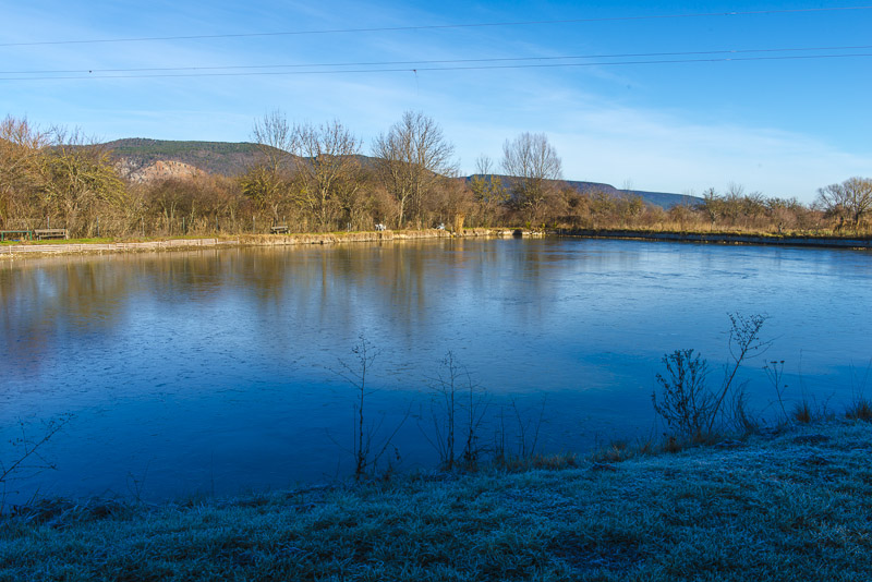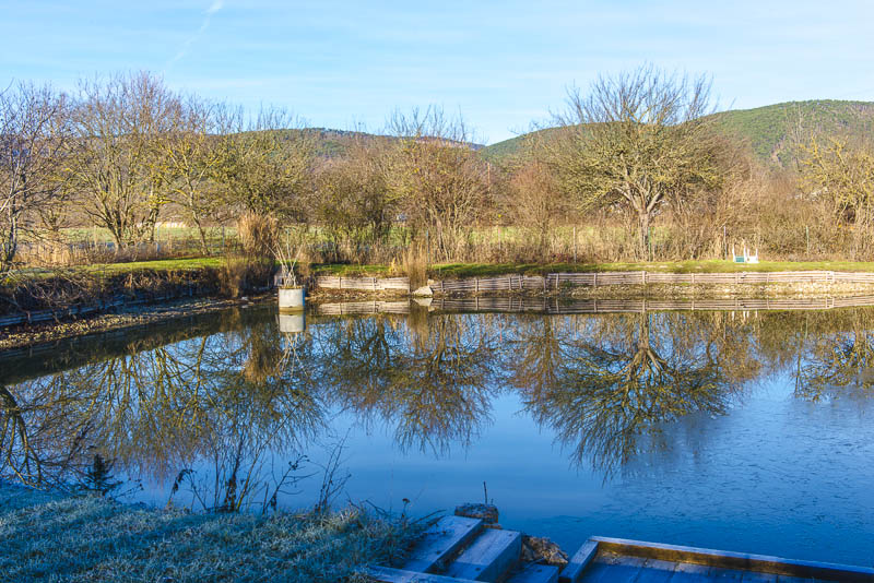 The pond near Saubersdorf is in shadow in large parts, so it is mostly frozen ...