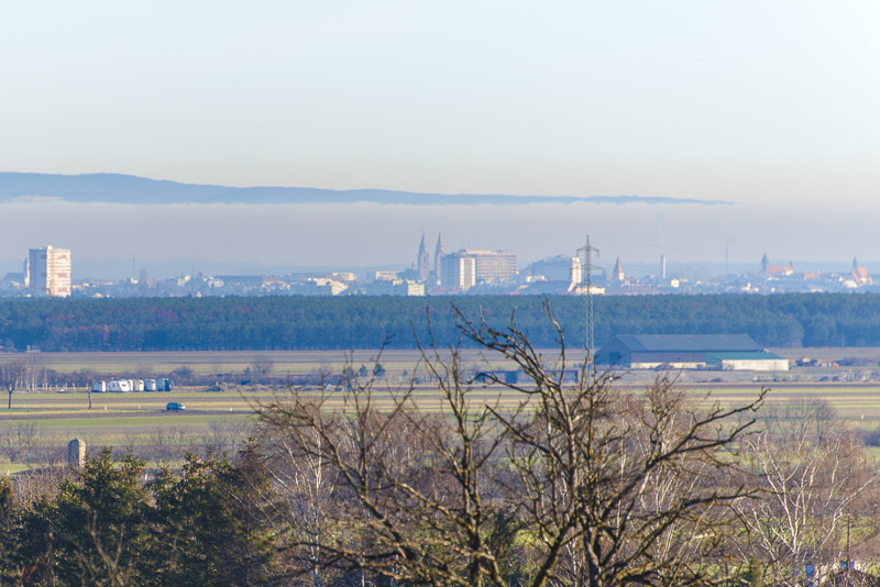 Wiener Neustadt: the cathedral, far right the water tower and the military academy. Ground fog in behind.
