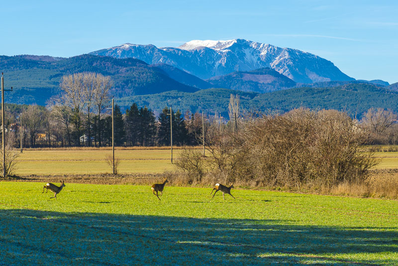 Shortly before St. Egyden, I hold the camera for a photograph of Schneeberg, when these roe deer run into the picture.