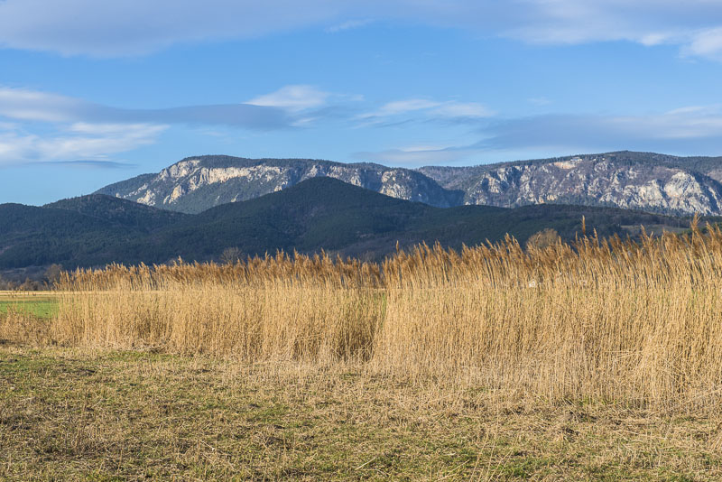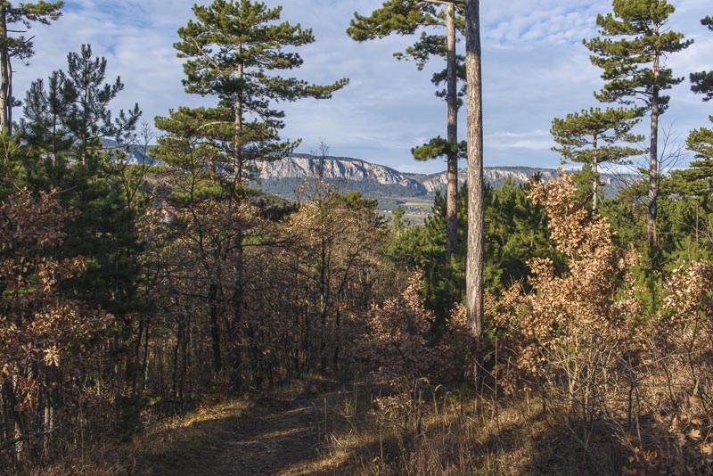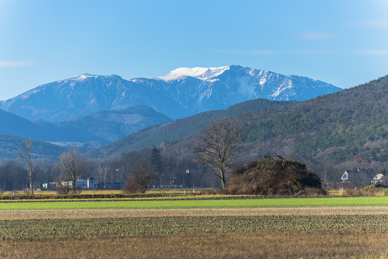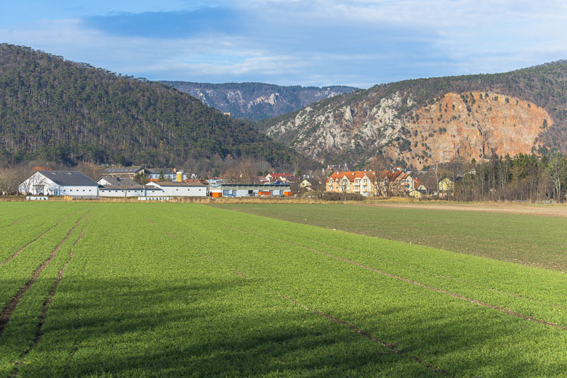 Es geht jetzt in die Fischauer Berge und durch den Wald. Durchblick zur Hohen Wand.