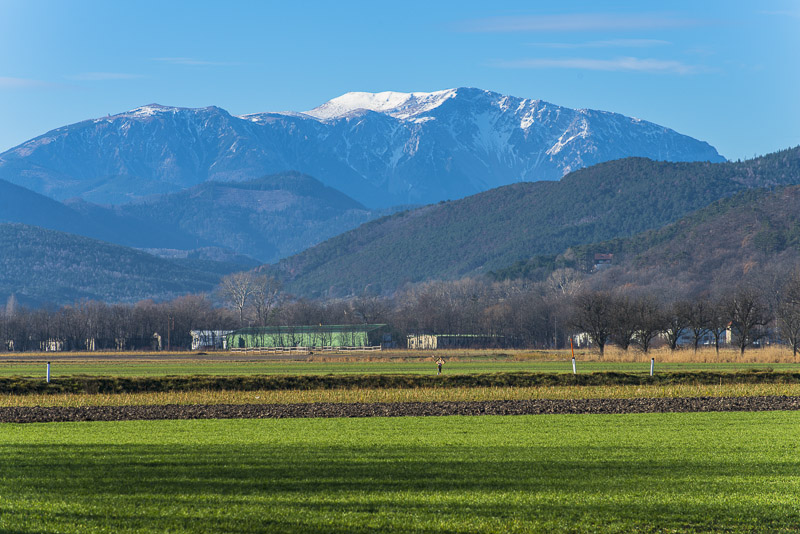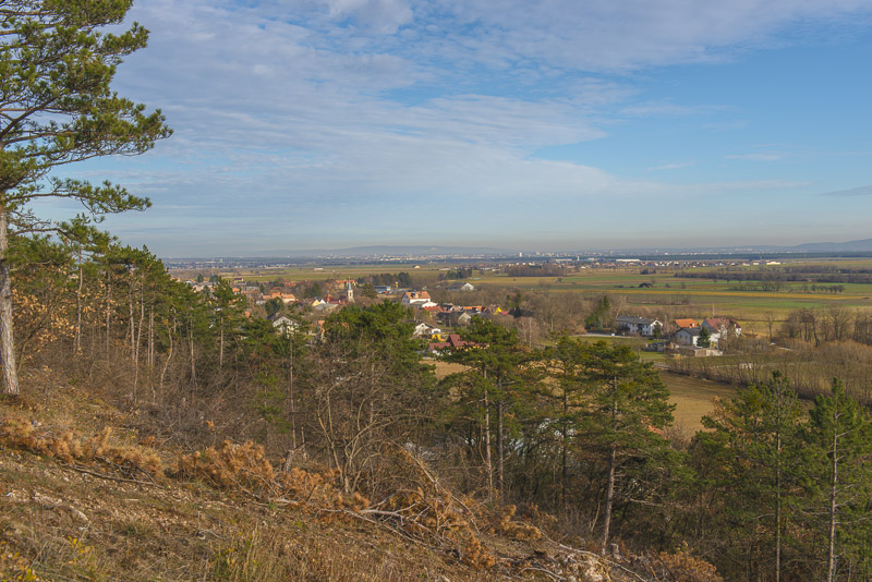 Am Blossen Berg. Blick nach Winzendorf und Wiener Neustadt, am Horizont das Leithagebirge.