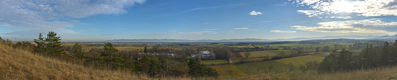 Panorama vom Blossen Berg - Blick auf das Steinfeld. Im Hintergrund die Rosalia, rechts Semmering und Wechsel. Hierher oder ins Bild klicken für eine größere Darstellung.