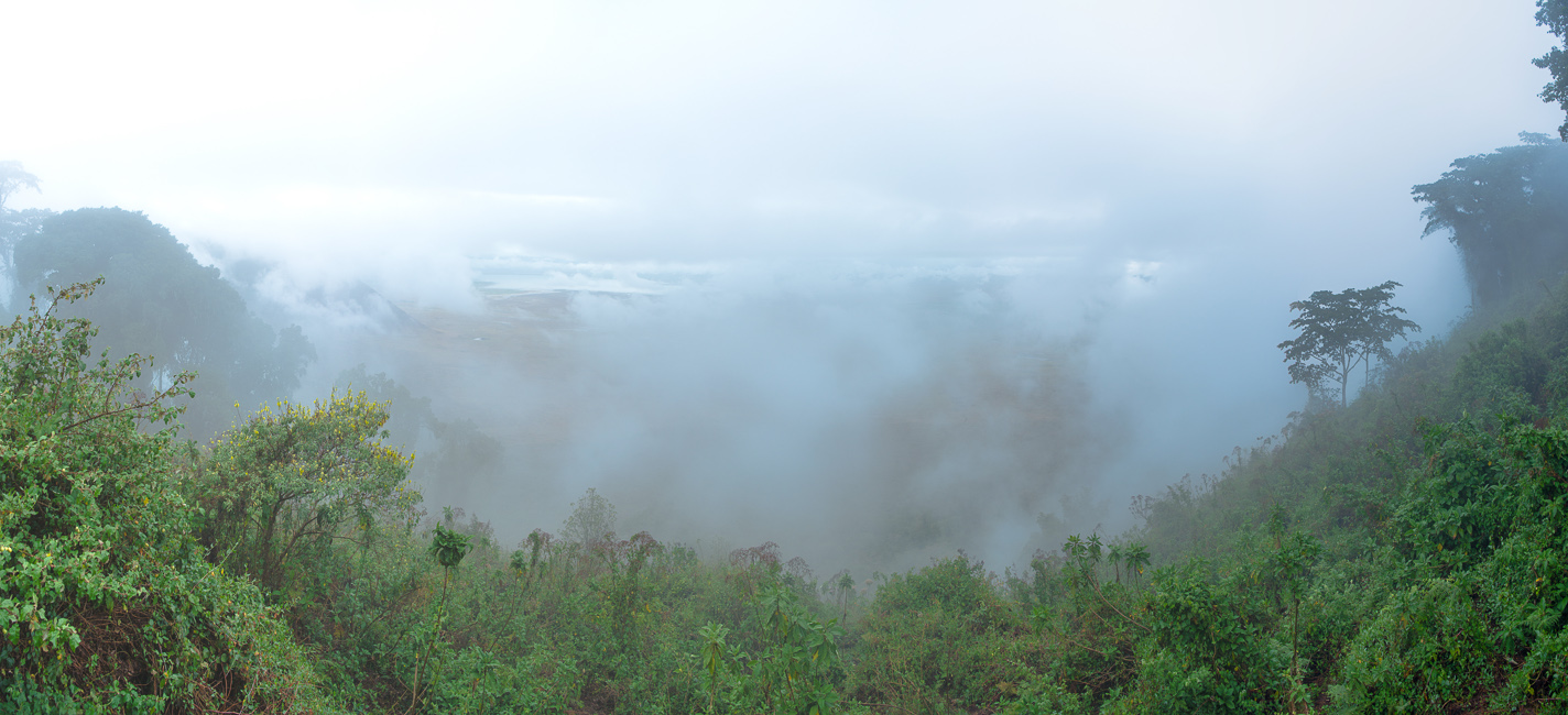 Nebel verhüllt die Aussicht auf den Ngorongoro - Krater.