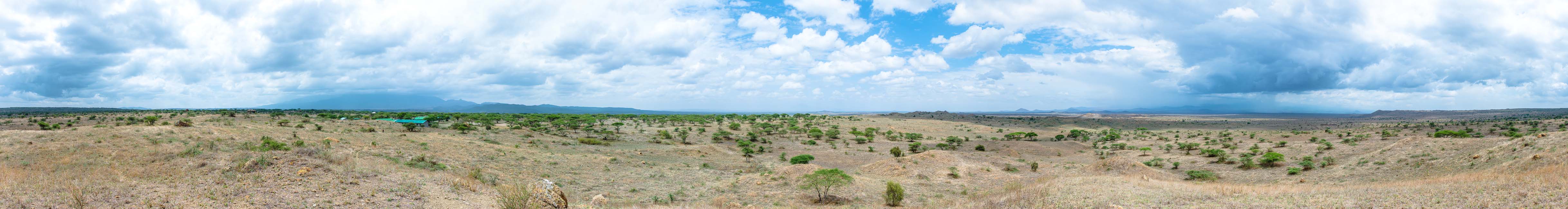Panoramablick über das Maasai Land zwischen Mount Meru (hinter den Häusern) und Kilimandscharo.