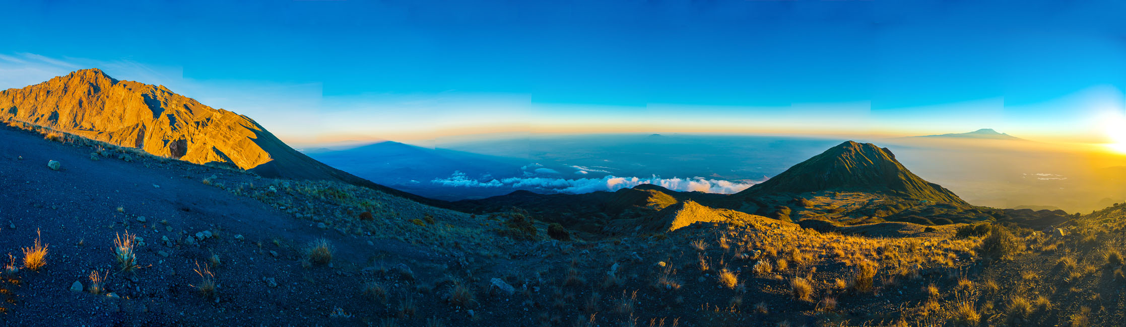 180 Grad Panorama (Nordhälfte) vom Rino Point. Großer und Kleiner Meru, in der Ferne der Kilimandscharo.