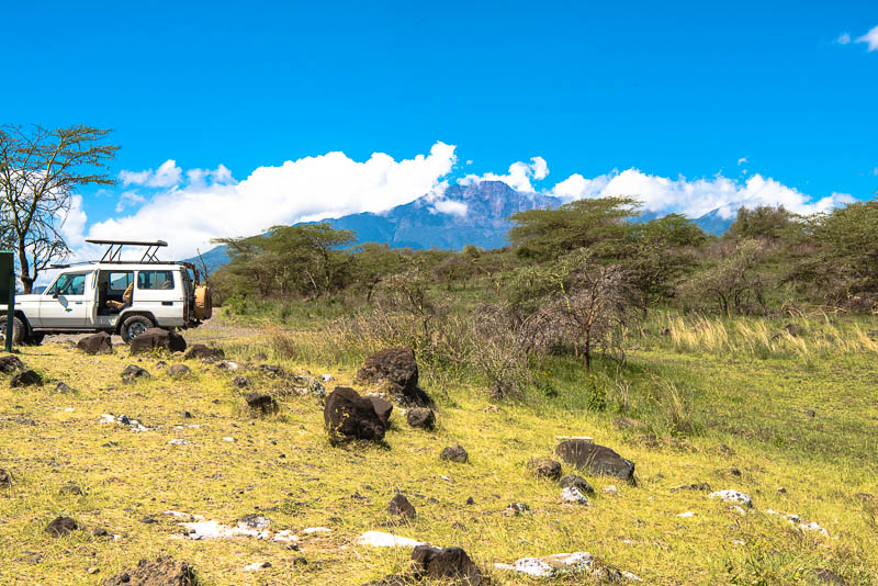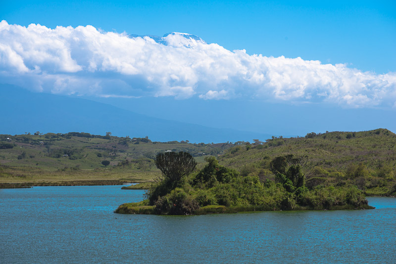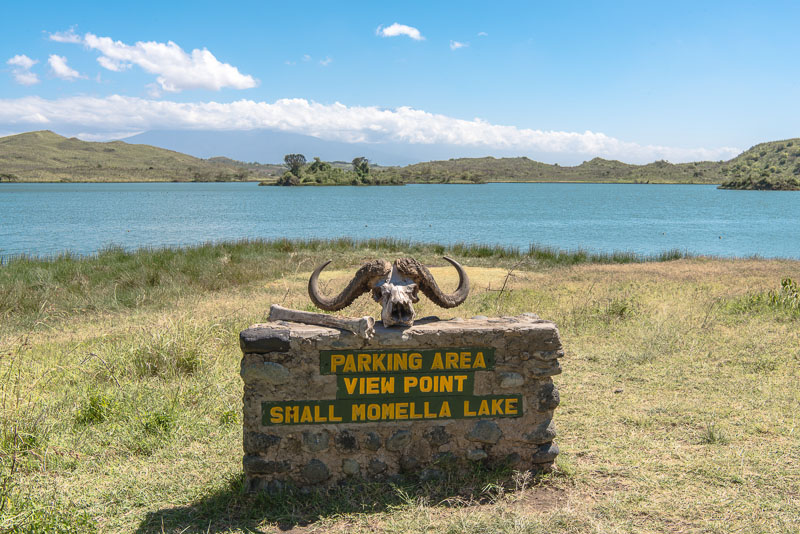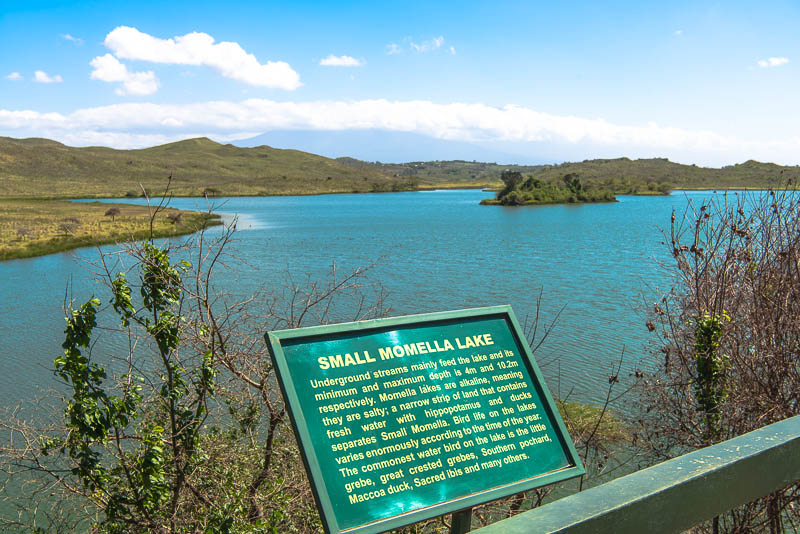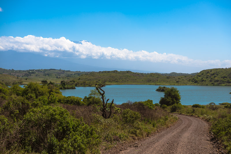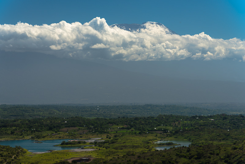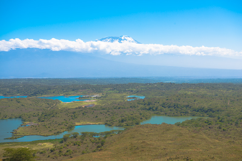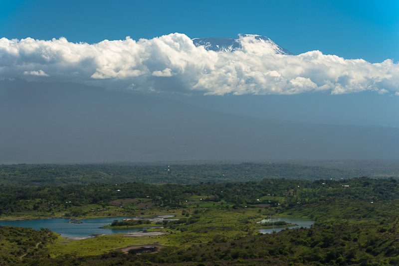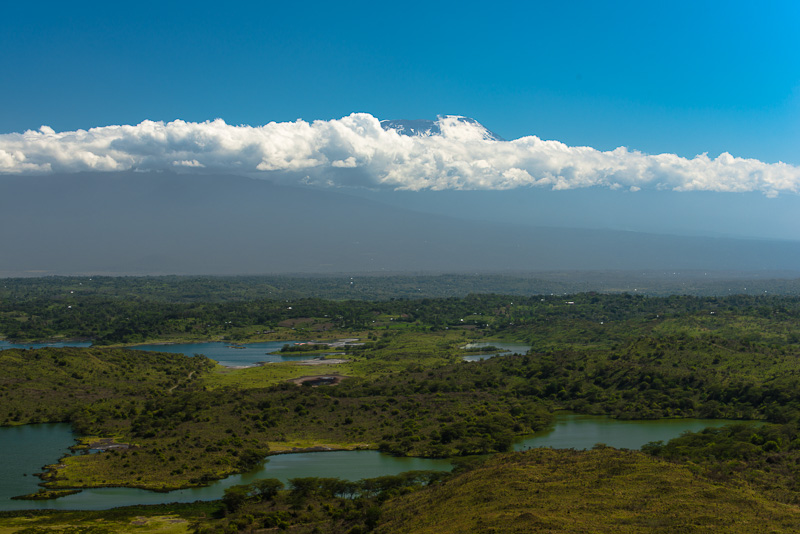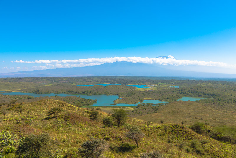 Wir fahren zuerst zu einem Aussichtspunkt, von dem aus man die beiden Momella - Seen wunderbar überblickt - mit dem Kilimandscharo dahinter.