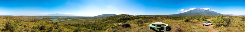360 Grad Panorama vom Aussichtspunkt zu den Momella - Seen. Kilimandscharo hinter den Momella - Seen, rechts der Meru. Hierher oder ins Bild klicken für eine größere Darstellung.