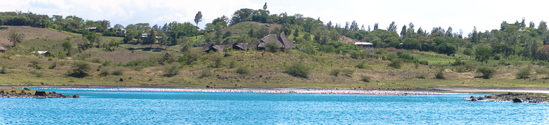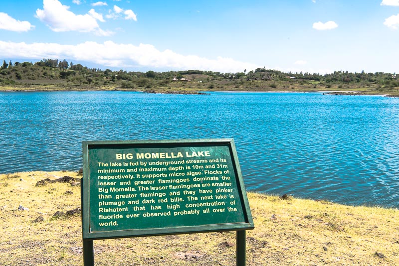 Panoramabild des Großen Momella Sees. Die weißen Schaumkronen am Ufer kommen von auskristallisiertem Natron. Hierher oder ins Bild klicken für eine größere Darstellung.
