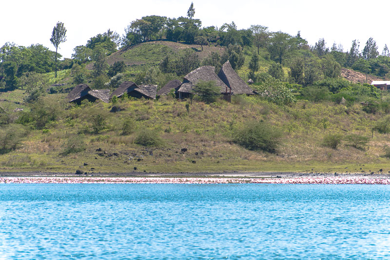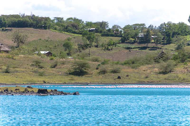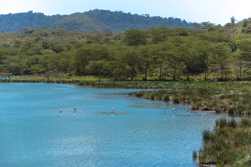 Manchmal sind die Momella Seen übersät von Zwergflamingos (Phoeniconaias minor). Momentan sind sie eher wieder am Abflug, nur auf der gegenüberliegenden Seite des Sees sieht man noch eine große Gruppe im Wasser stehen.