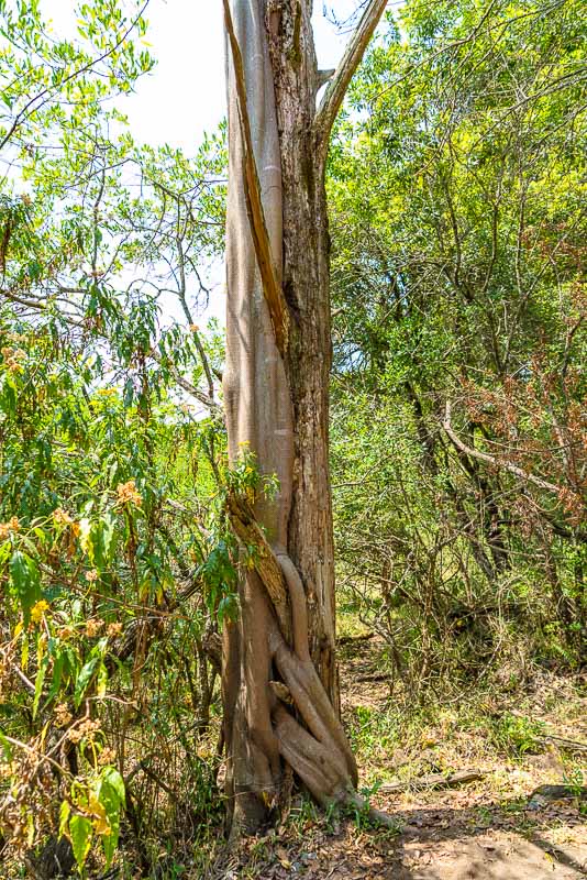 Das sind eigentlich zwei Bäume. Der erste Baum ist bereits abgestorben und ohne Rinde, während der zweite Baum - eine Feigenart - seine Äste und Luftwurzeln fest um den ersten Baum schlingt und ihn auf diese Weise abgetötet hat. Die Feige wird durch Vögel verschleppt, keimt in Astgabeln und sendet von dort Triebe nach oben und Wurzeln nach unten. Die Wurzeln vereinigen sich zu einem engen Geflecht, das den Wirtsbaum schließlich tötet und in die Erde einwächst, zum Wasser. Wenn der Wirtsbaum abgestorben ist, sind die Feigentriebe und Wurzeln bereits so fest, dass die Feige stehen bleibt, auch wenn der Wirtsbaum langsam vermodert.