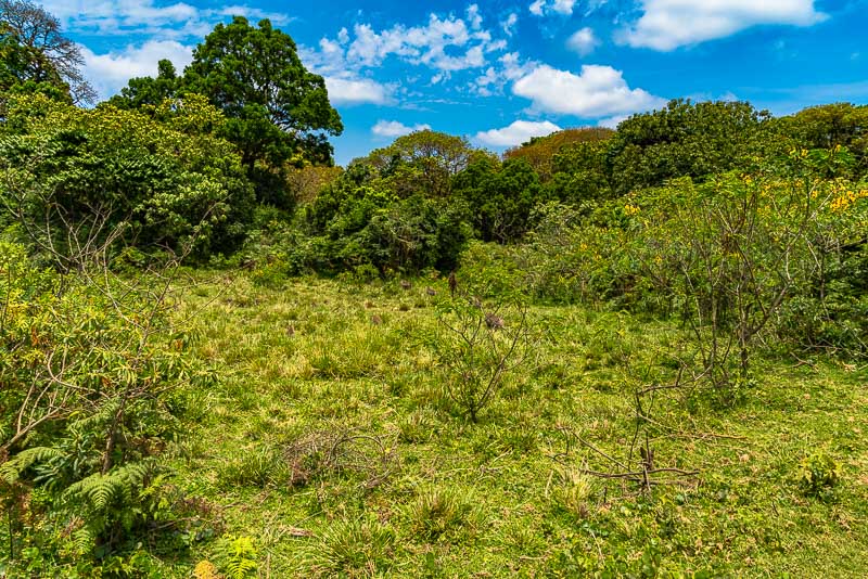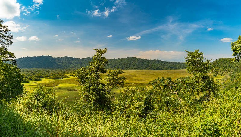 ... Ngurdoto - Krater. Vom Aussichtspunkt ist lediglich die große Grasfläche zu sehen, keine Tiere.