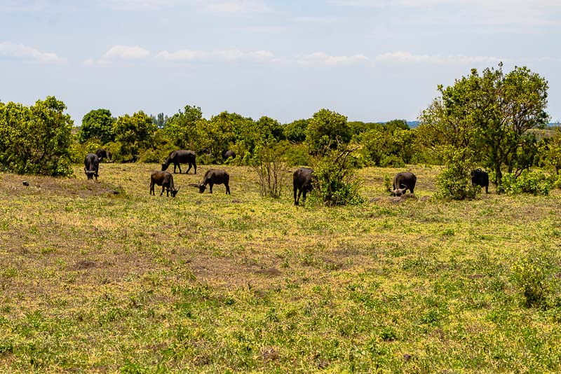Beim Gate vorbei fahren wir in etwas tiefere Regionen Richtung Momella - Seen. Dutzende Büffel grasen hier.