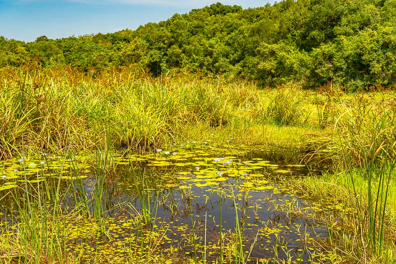 Hier ist das Gras immer feucht, weil der Boden von unten Grundwasser erhält. Quasi ein riesiger Quellhorizont.