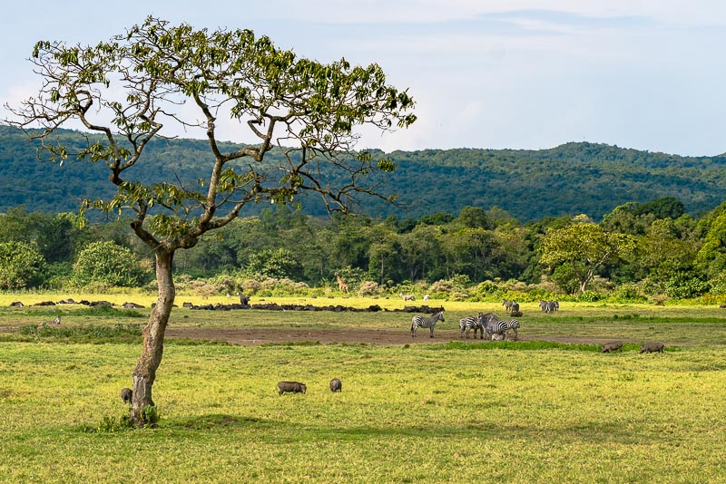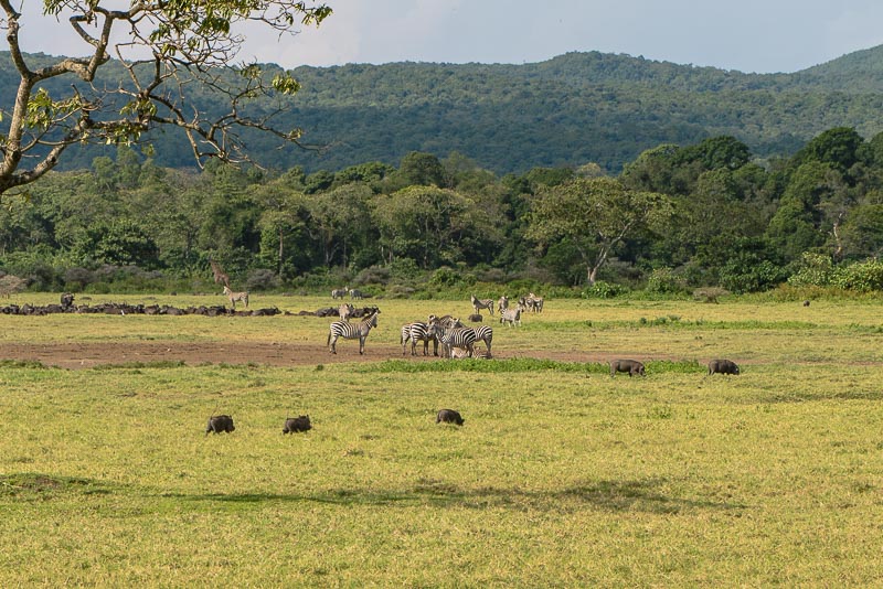 ... mit diversen Tieren: Zebras, Warzenschweine, Büffel, am Waldrand auch eine Giraffe.
