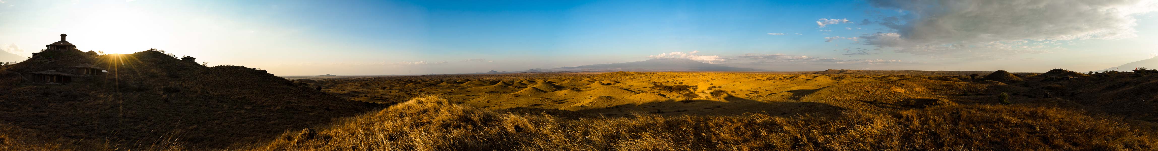 Panorama der Maasai Steppe bei der Original Maasai Lodge. Ganz links Gebäude der Lodge, in der Mitte der Kilimandscharo, ganz rechts der Mount Meru.