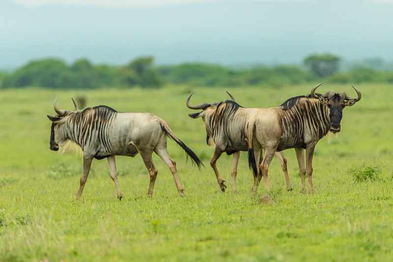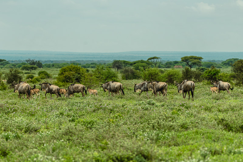 Eine ganze Herde östlicher Weißbart - Gnu´s mit Jungtieren.