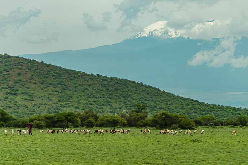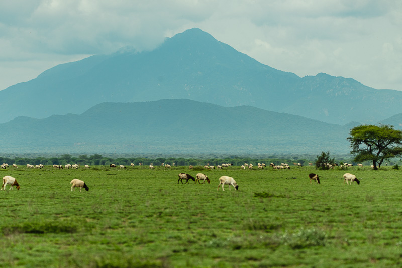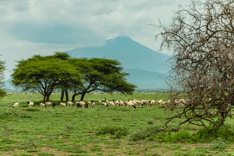 Die Herden der Maasai, im Hintergrund der Mount Longido.