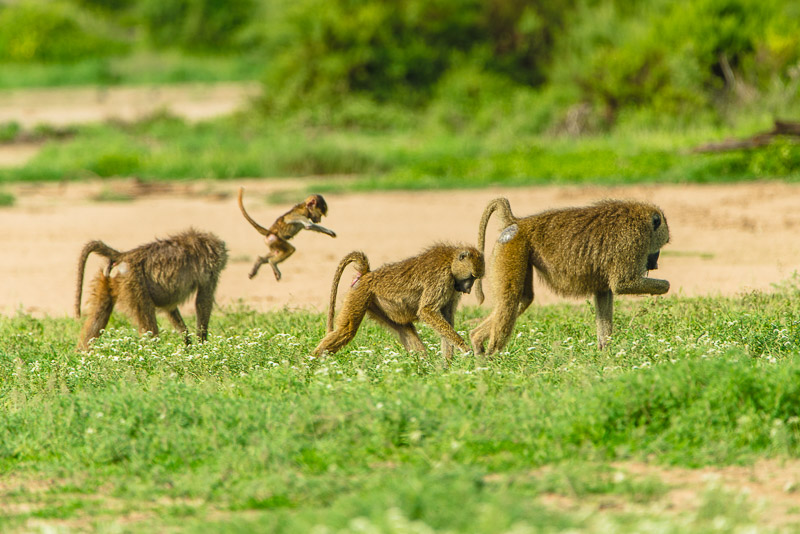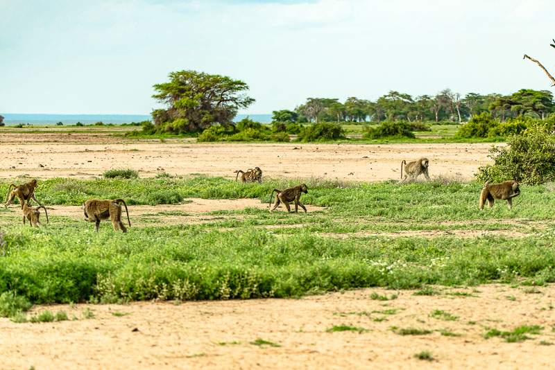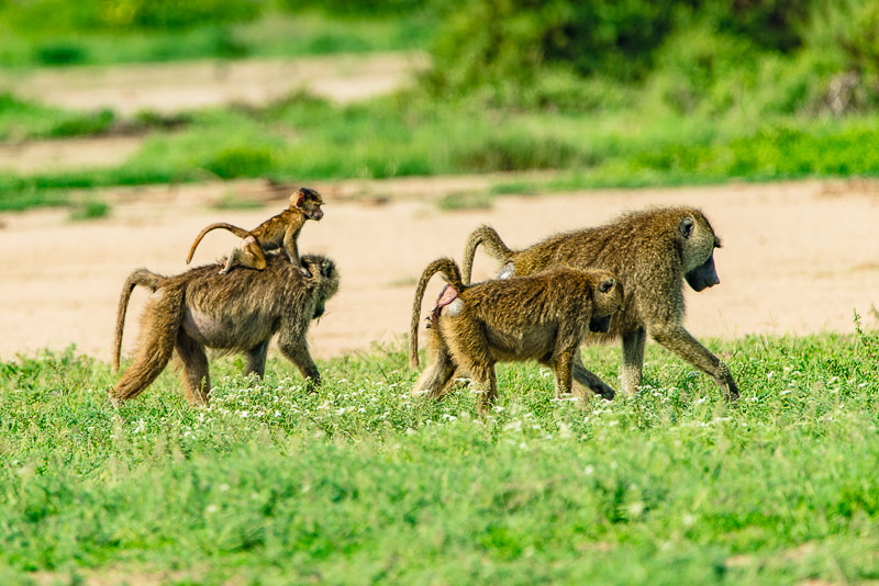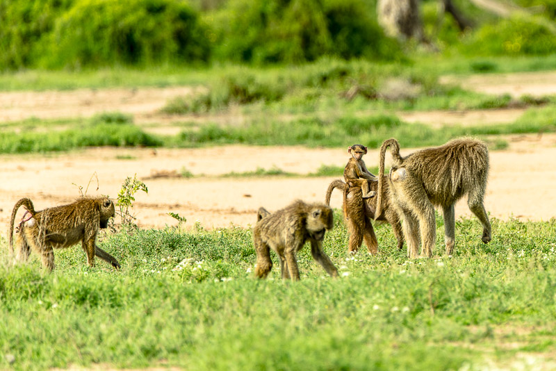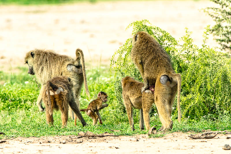 Wir treffen nun auf einige Familien von Anubispavianen (Papio anubis).