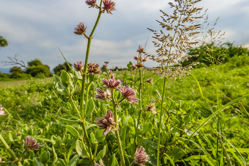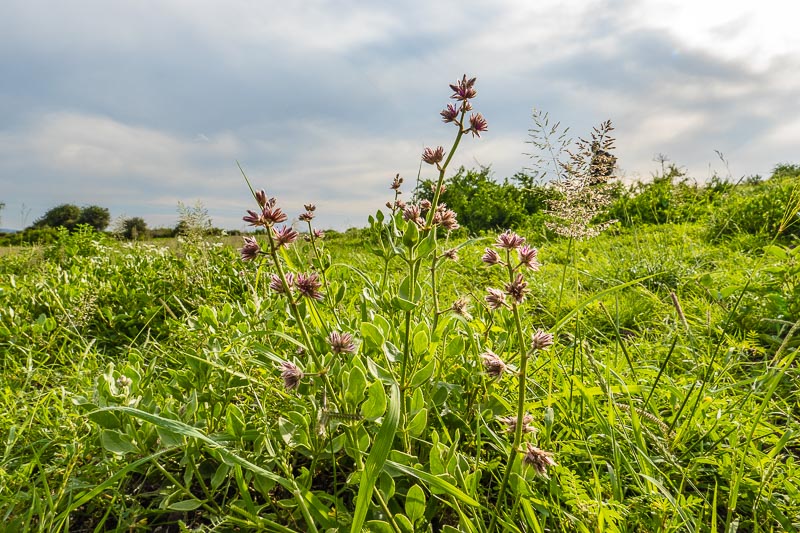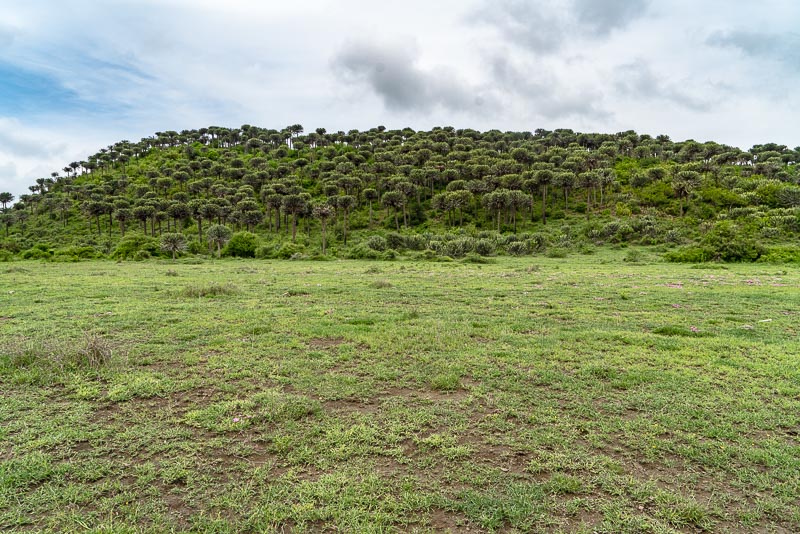 Mitten in der Ebene ein Hügel, auf dem Euphorbien wachsen.