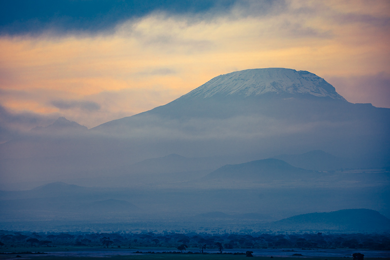Leider ziehen jetzt vom Kenianischen Amboseli-Nationalpark Wolken herein, und der Zauber ist schnell wieder vorbei, sodass wir bald wieder hinunter wandern.