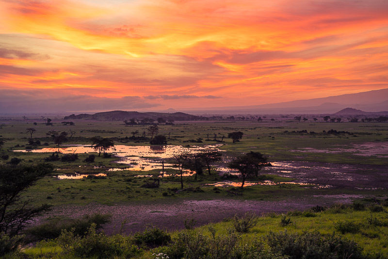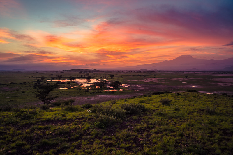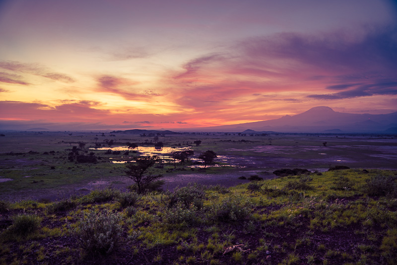 Vor dem Frühstück gehen wir aber noch kurz zum Sonnenaufgang auf den Hügel. Neben dem Kilimandscharo färbt sich der Himmel über Kenia rot.