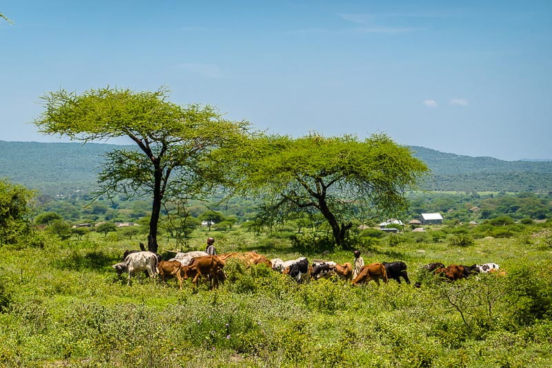 28.2.2021: amVormittag wieder unterwegs zur Schule. Maasaikinder hüten ihre Rinderherden.