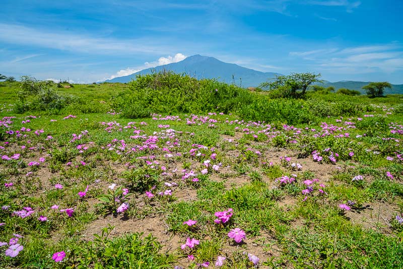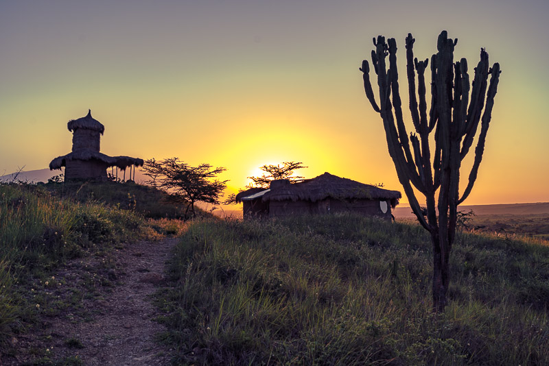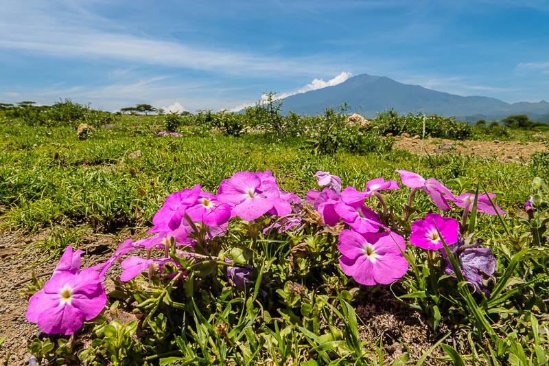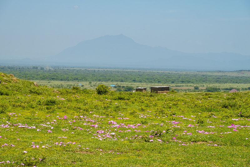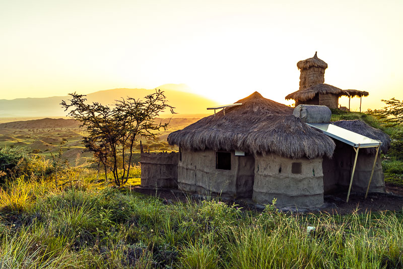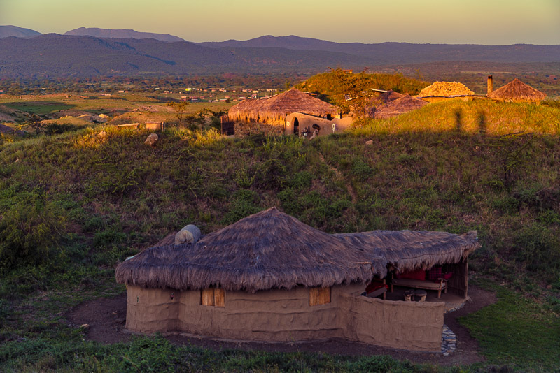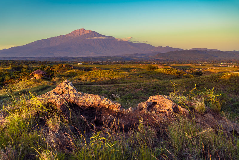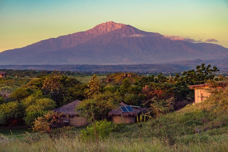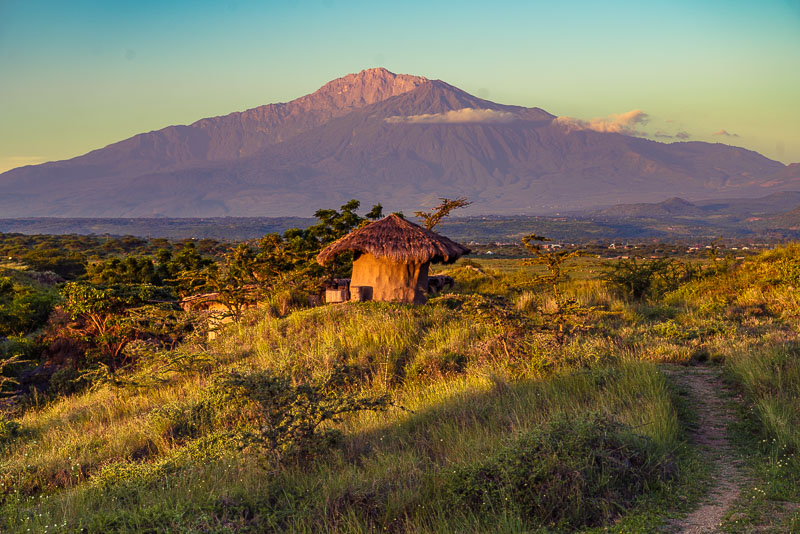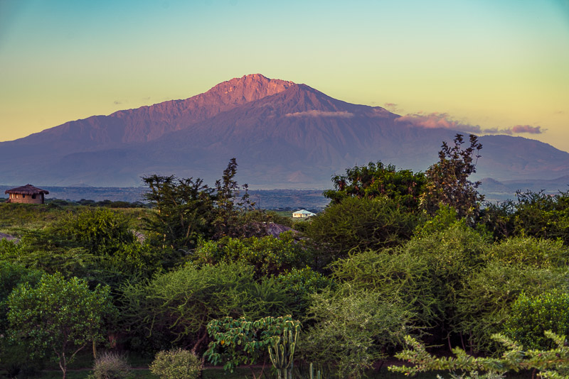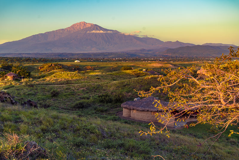 Mount Meru und das Wächterhäuschen der Original Maasai Lodge. Das Gelände wird Tag und Nacht bewacht.