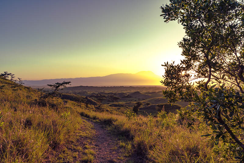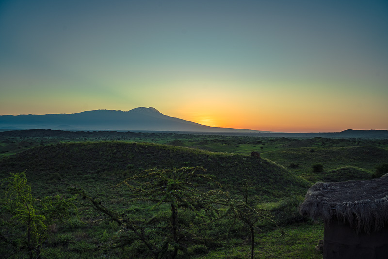 Wie immer in Afrika bin ich recht früh schlafen gegangen, und wache daher schon bald nach 6 Uhr auf - mit schweren Beinen gehe ich raus und begrüße die Sonne, die gleich hinter dem Kilimandscharo aufgehen wird.