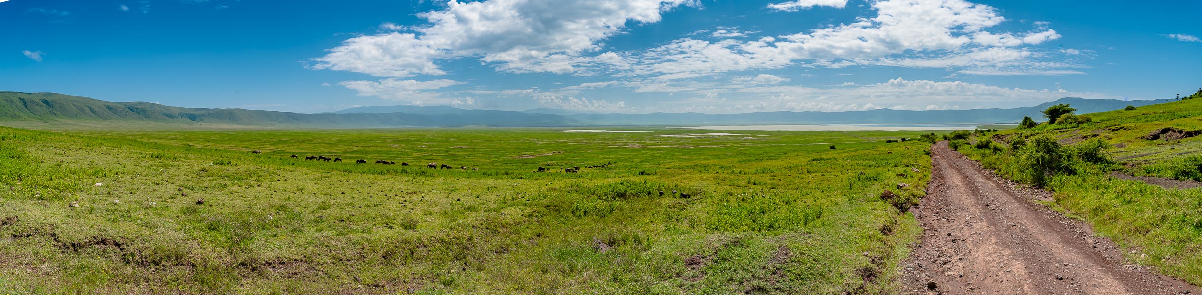 Panorama das Ngorongoro - Kraters, auf den letzten Metern der Straße hinunter. Die Dimensionen sind riesig - der Durchmesser beträgt zwischen 17 und 21 km, die Fläche 264 km2.