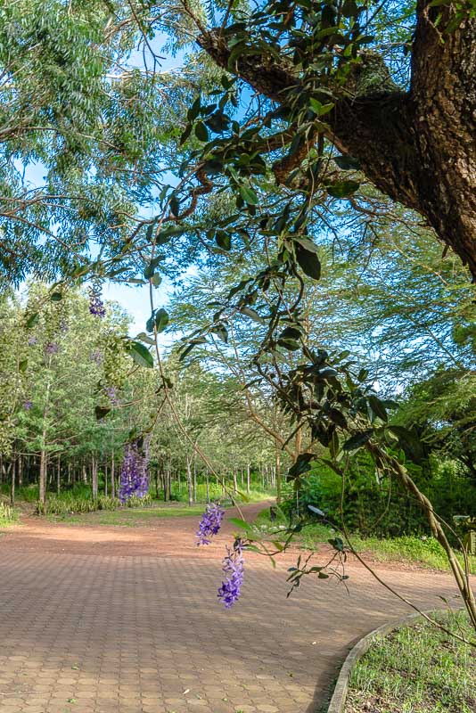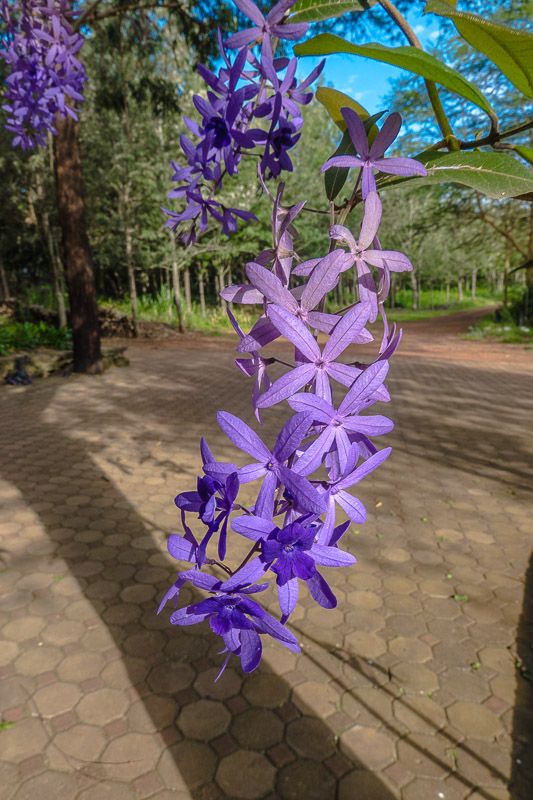 Bei der Rezeption hängt blühender Purpurkranz (Petrea volubilis) von den Bäumen.