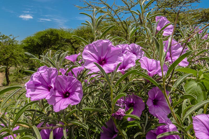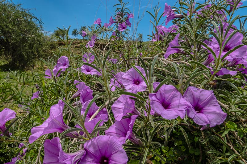 An diesem geschützten (und sicher auch etwas feuchteren) Platz blüht die Jäger´s Prachtwinde (Ipomoea Jaegeri), eine Verwandte unserer Ackerwinde, ganz besonders üppig.