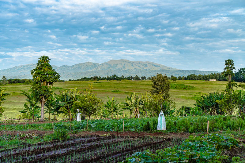 Blick über die Plantagen zu den Bergen am Kraterrand (Mt. Oldeani, 3.206 m und Makomba Peak, 2.967 m), die wir gestern in der Früh auf halber Höhe überquert haben.