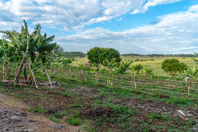 Bananen, Kürbisse am Zaun, vorne ein ganz junger Mangobaum. Alles wächst hier durcheinander, wie so oft in Afrika.