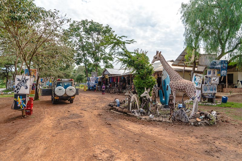 Am Rückweg halten wir in Karatu bei einem typischen Souvenirshop. Alles gibt es hier, was das Land zu bieten hat, vor allem Holzschnitzereien und einheimische Kunst.
