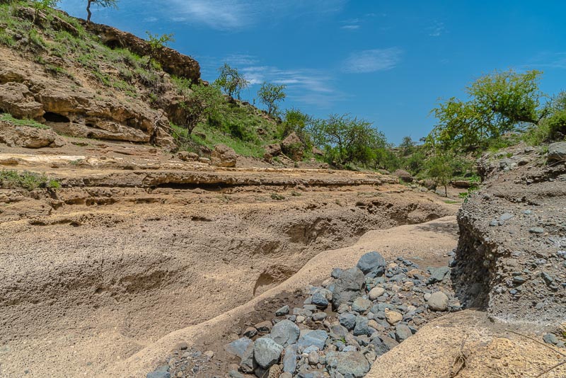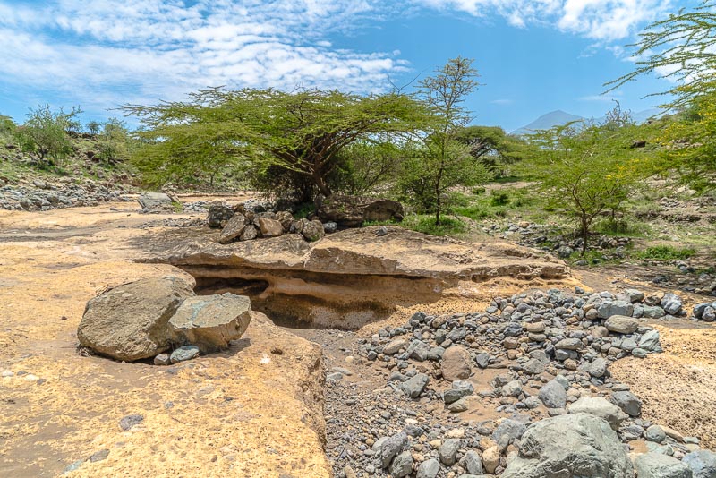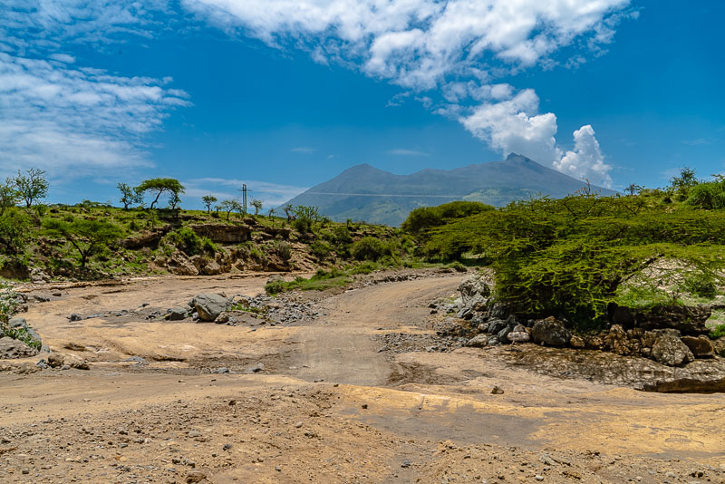 Wir sind wieder eingebogen von der Hauptstraße nach Nairobi, in die Sandstraße entlang des Mount Meru. Hier wird gerade eine der vielen kleinen Schluchten durchquert.