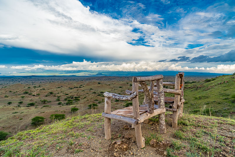 Die ganze Lodge ist mit ihren einzelnen Hütten auf einer Landschaft mit steilen Hügeln errichtet, von denen man einen grandiosen Rundumblick hat - vom höchsten Hügel hier tatsächlich 360 Grad - in alle Richtungen.