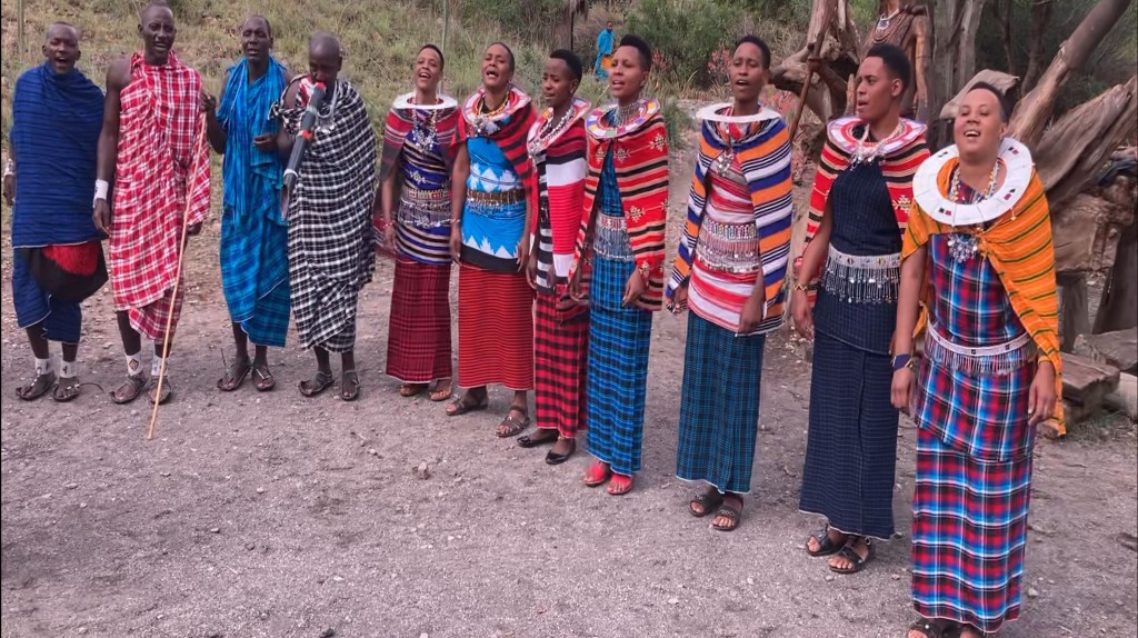 Das Personal weiß Bescheid, dass jemand ankommen wird, das Auto fährt vorher über den Nachbarhügel und wird daher 2 Minuten früher schon gesehen. Flugs formiert sich eine Gruppe, die zur Begrüßung ein Maasai - Lied singt.