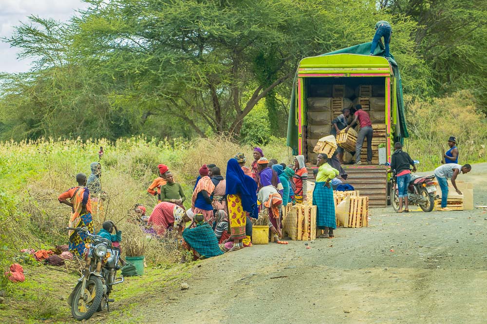 Am Rückweg sehen wir Erntehelfer, die gerade den Tomaten - LKW beladen. Dieser fährt nach Daressalam, wo die Tomaten auf dem Markt verkauft werden. Sie sind dort wegen ihres guten Geschmacks, den sie dem nährstoffreichen Vulkanboden hier verdanken, sehr beliebt. Ich habe gefragt: pro Tag erhalten diese Menschen etwa 4-5 Euro. Das erscheint uns zwar sehr wenig, da aber alles viel billiger ist als bei uns, kann man davon - mehr schlecht als recht - leben. Schulgeld für die Kinder geht sich dabei aber natürlich nicht aus.
