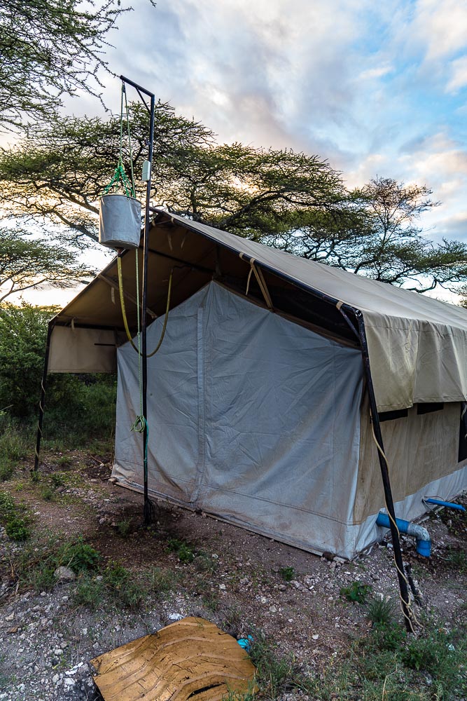 Die gestrige Dusche hatte eine ganz besondere Vorrichtung: du machst dir einen Zeitpunkt aus, zu dem füllt einer draußen den Kübel mit warmem Wasser und zieht ihn am Seil hinauf. Wenn er oben ist, füllt sich der Schlauch, und du kannst drinnen duschen. Duschen ist hier kein Luxus, weil nach einer langen Fahrt über Sandstraßen bist du richtiggehend mit Staub paniert.
