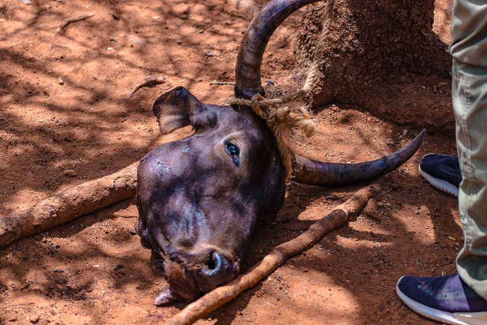 Auf Kommando fällt die Meute über den Kuhkopf her.