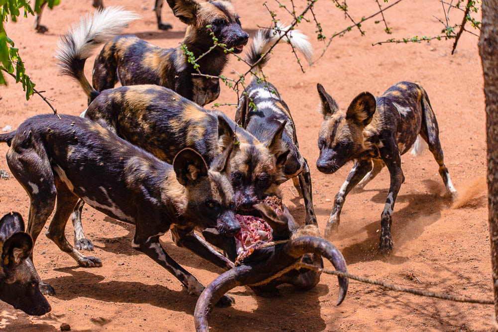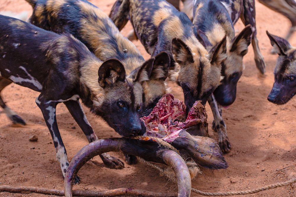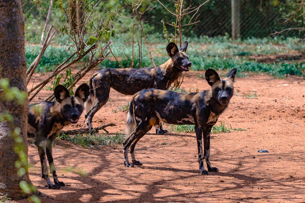 Wir fahren jetzt eine ermüdende Stunde lang durch Buschwerk wo kaum ein Tier zu sehen ist, bis wir das Gehege mit den afrikanischen Wildhunden erreichen.
