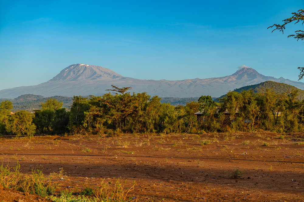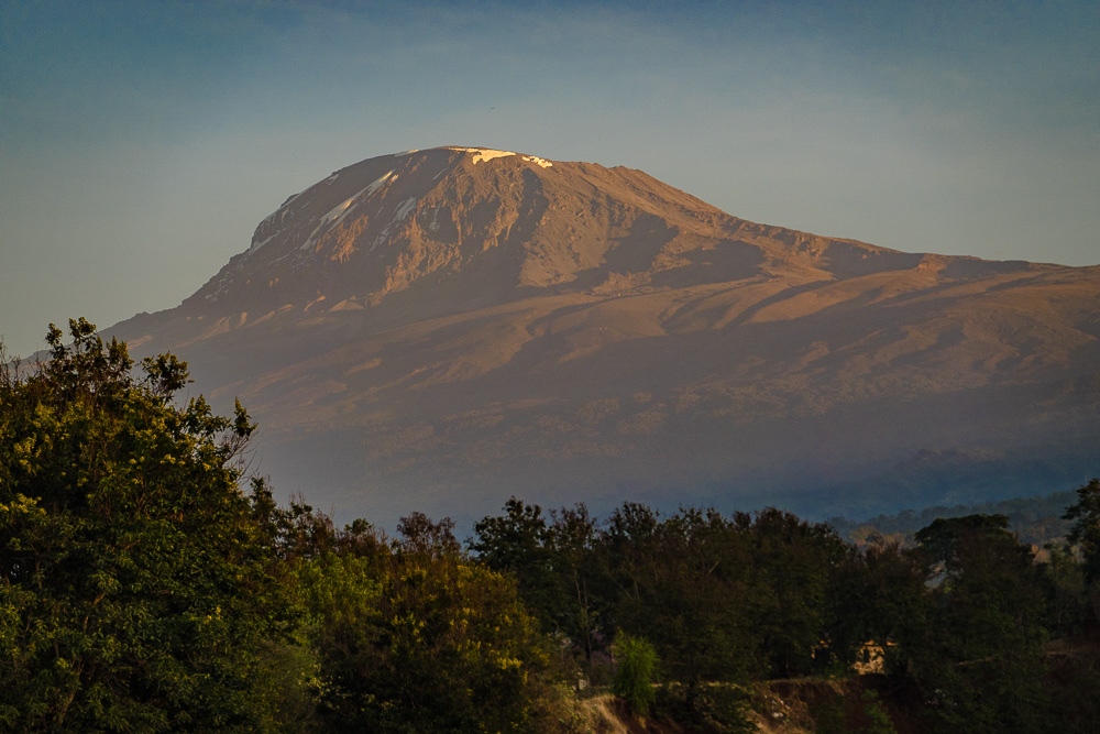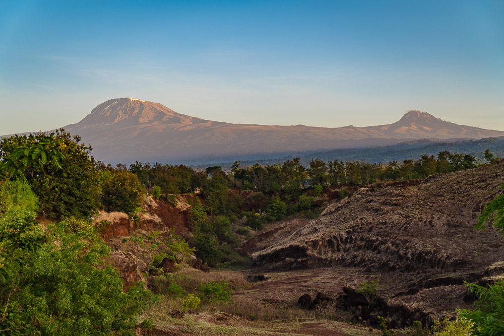 Wir brechen um 6 Uhr früh auf. In morgendlicher Frische begrüßt uns der Kilimandscharo, mit seinem Begleiter, dem Mawenzi (5.148 m).