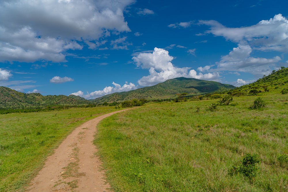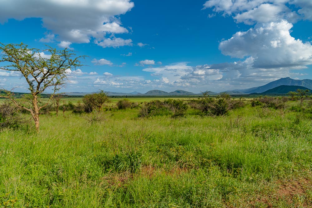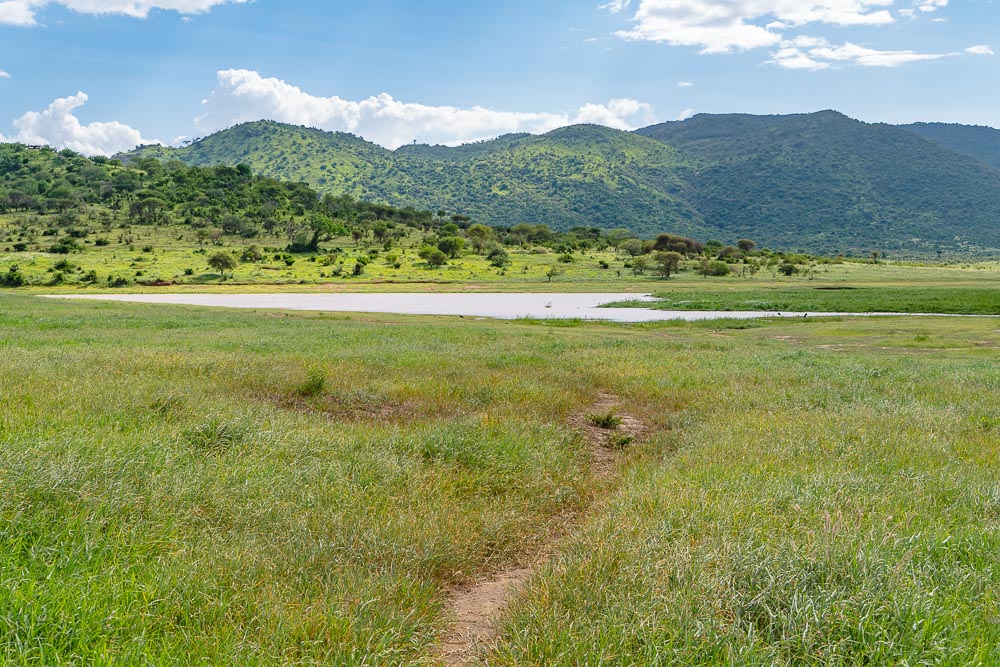 Umkränzt von Bergen ertstreckt sich eine riesige Talebene, die derzeit, nach einigen Tagen Regen, von üppigem Grün bewachsen ist. Es gibt aber kaum offenes Wasser, sodass Tiere seltener sind als anderswo.