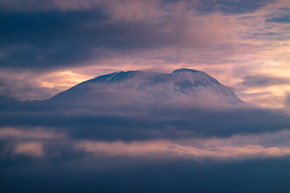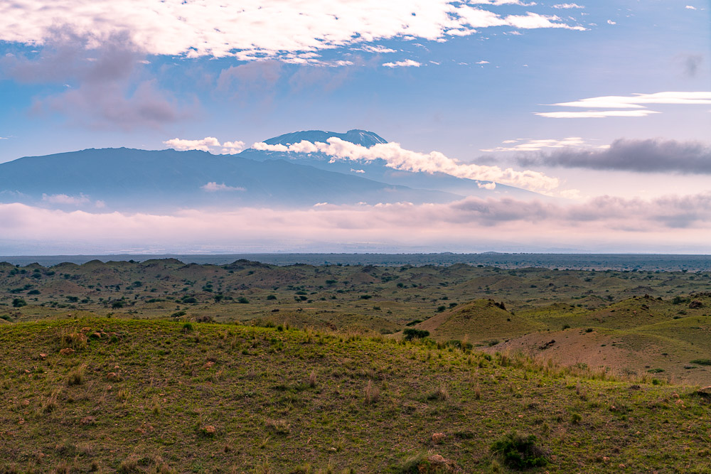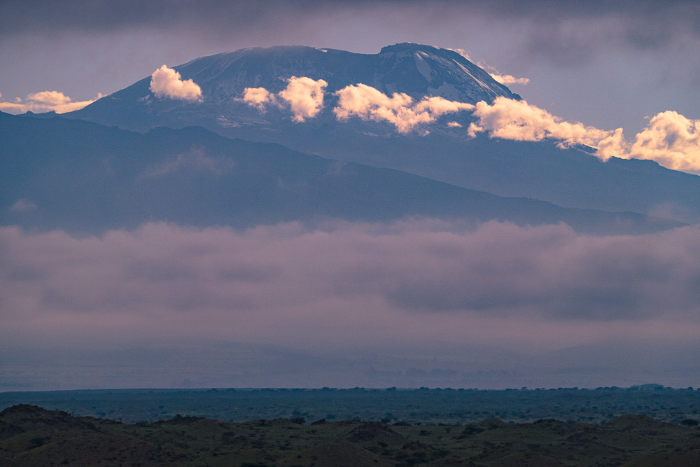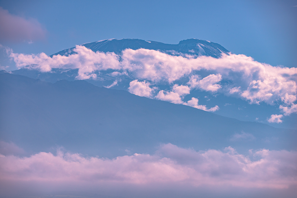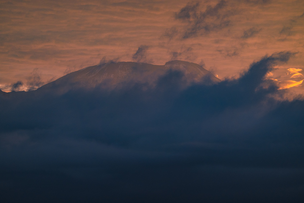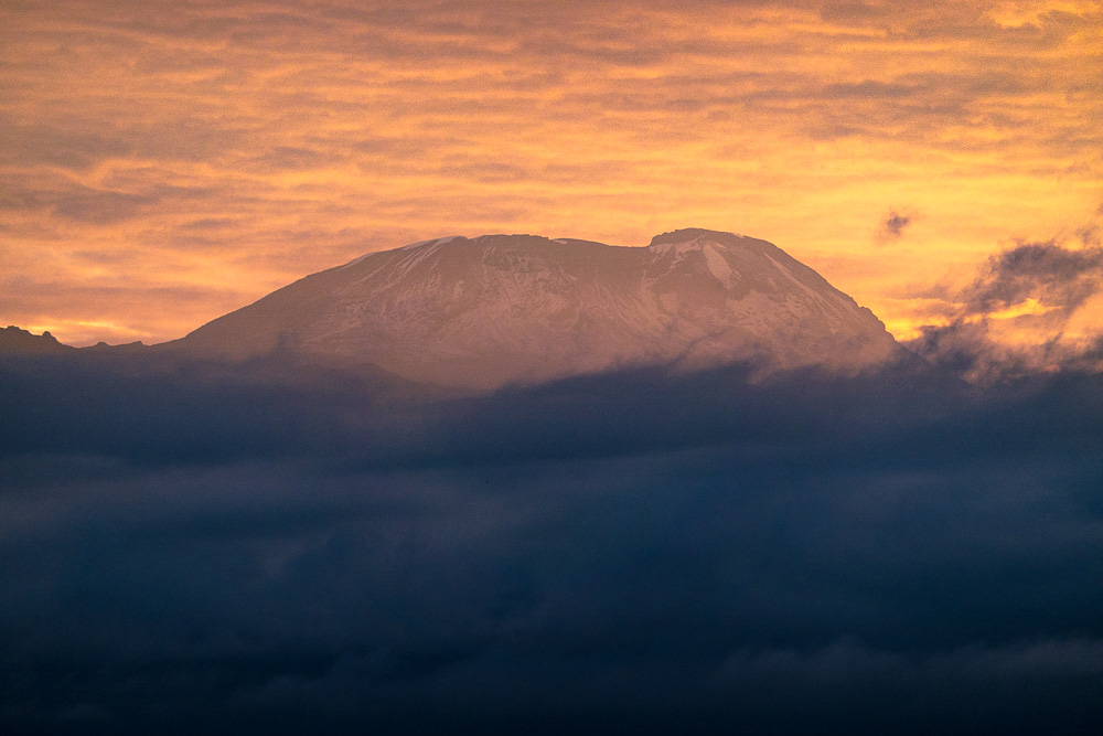 Noch liegt aber eine niedrige Wolkendecke vor dem Kilimandscharo, nur der Gipfel ist sichtbar..