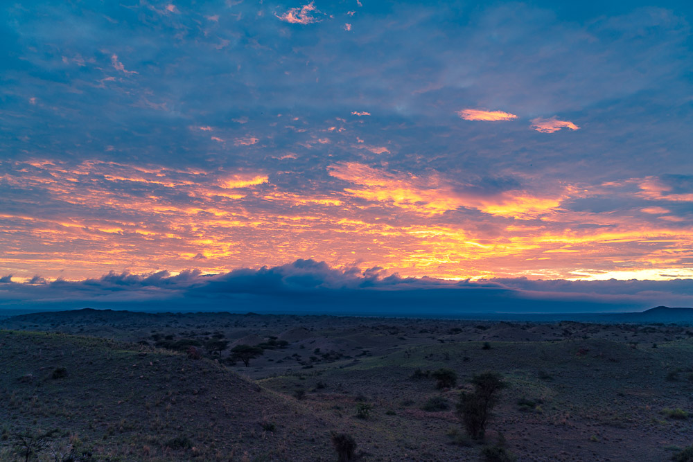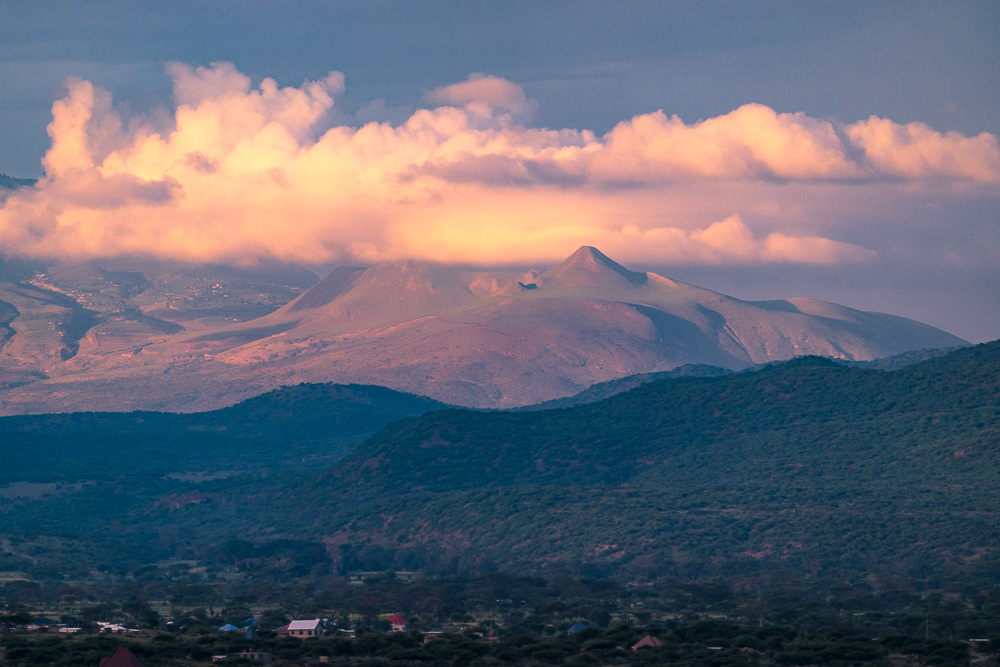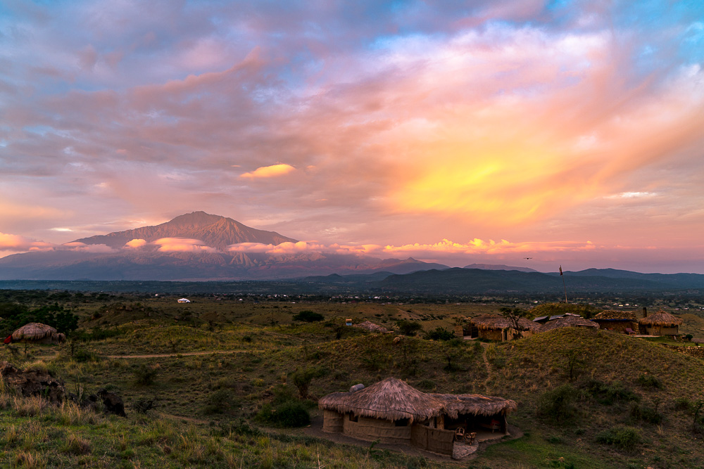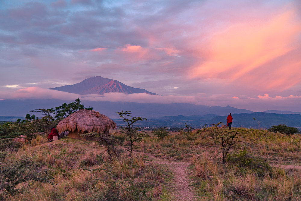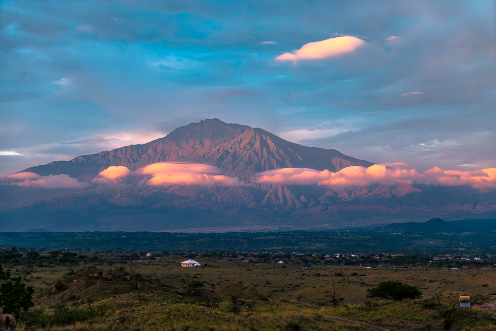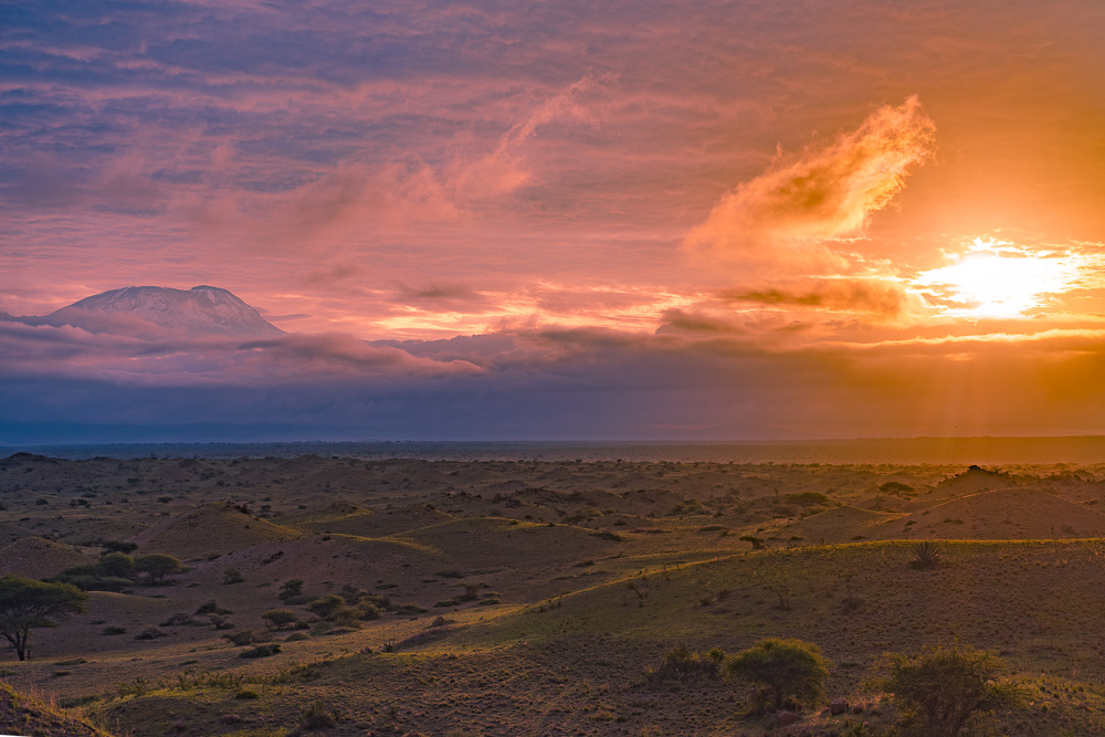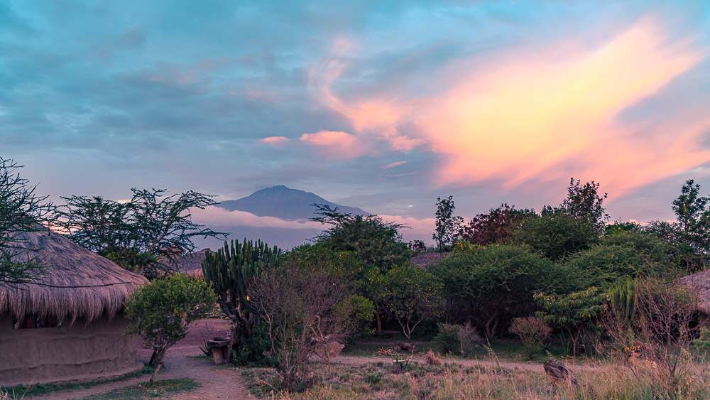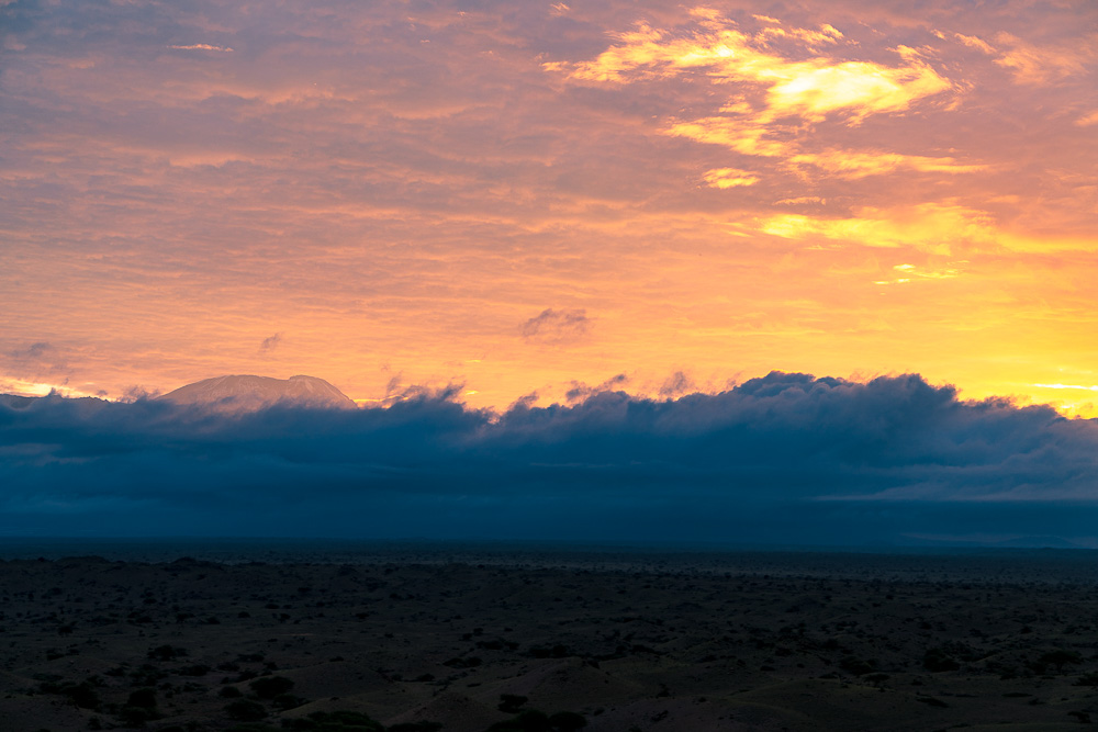 Ich stehe früh auf. Wolken über dem Kilimandscharo, aber dahinter leuchtet ein wunderschönes Morgenrot.