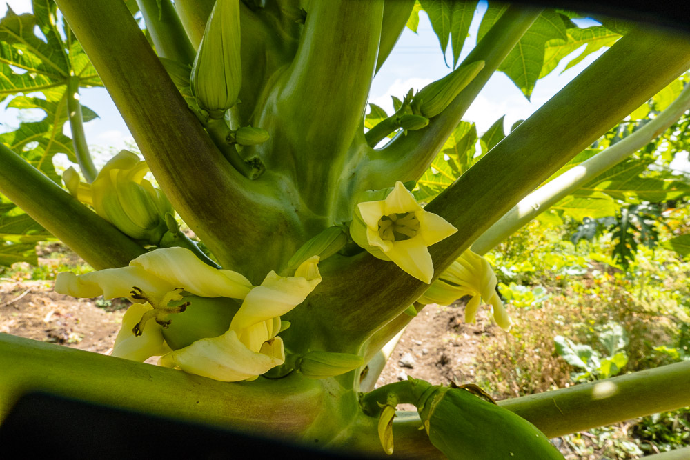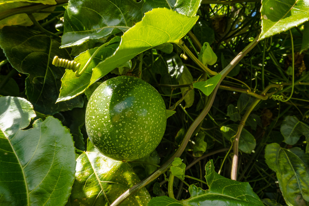 Ein kleiner Rundgang durch den Permakulturgarten. Der Zaun wird dicht von Maracujapflanzen überwuchert, ...