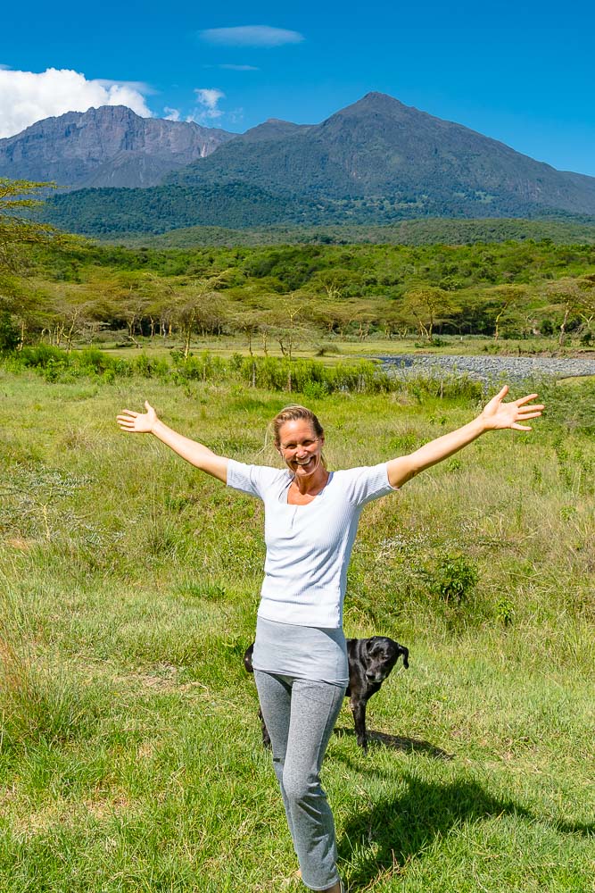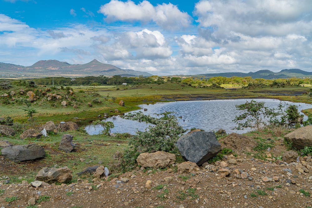 Am Vormittag fahren wir nach Momella. Zwischendurch halten wir vor Ngare Nanjuki, Blick zum Mount Mukuru. Der Teich vorne gehört zum Ngare Nanjuki River.