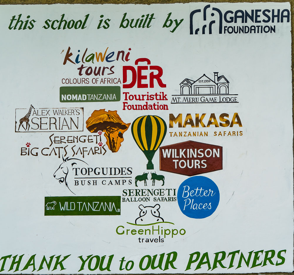 Vor der Schule wird in einem Plakat auf die Sponsoren (Gansesha Foundation) und die Partner (lokale Touristikbetriebe, in denen die Schüler Praktika machen können) hingewiesen. Auch in der Maasai Lodge waren vor dem Jahreswechsel, während der Ferien, Schüler von hier an der Arbeit. Jetzt ist wieder Schulbetrieb.