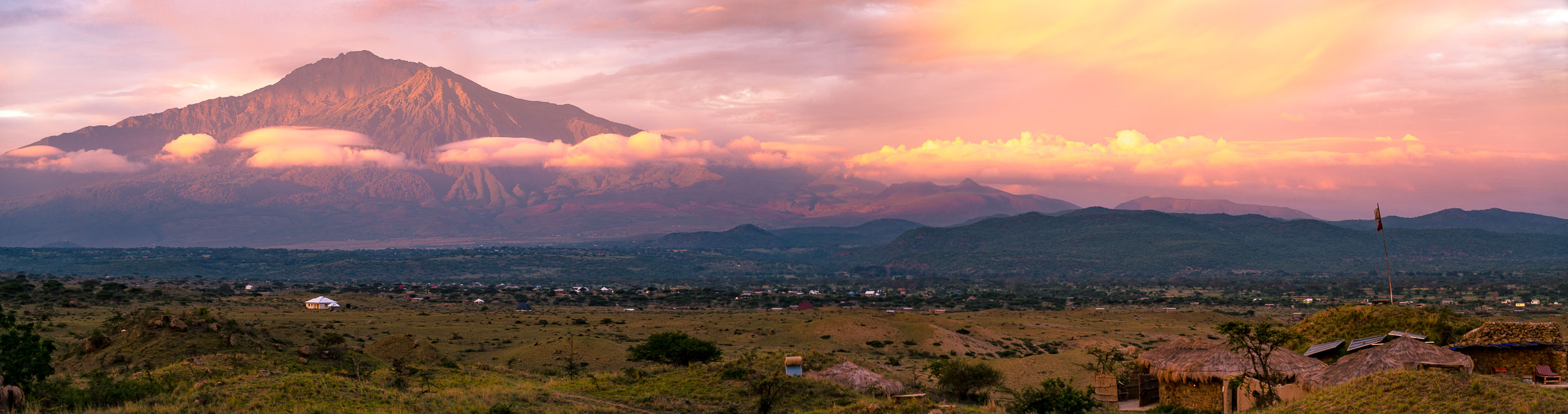 Panorama des Mount Meru in der Morgensonne, mit dem Mt. Mukuru rechts davon.