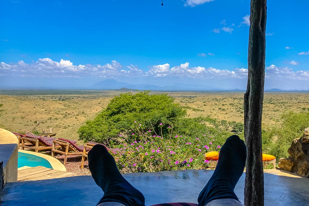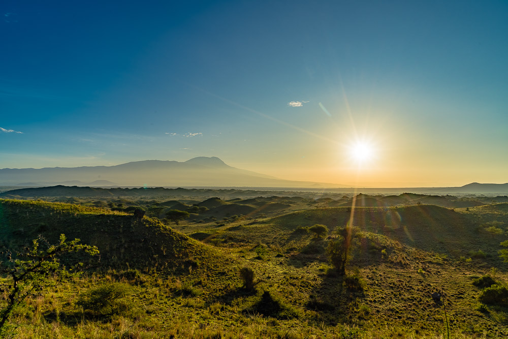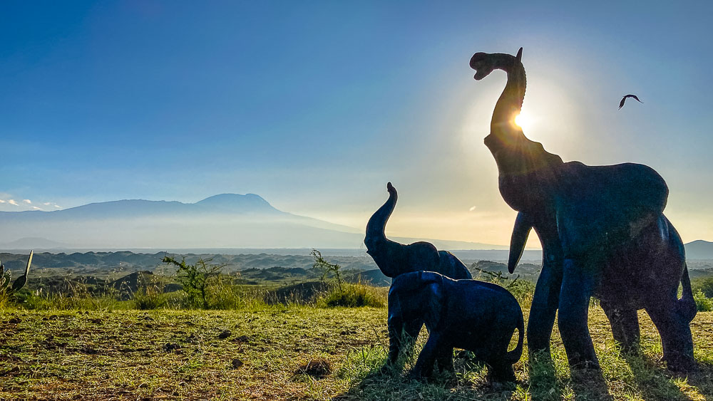 Das Frühstück findet heute wieder im Freien statt, mit Blick auf den Kilimandscharo.